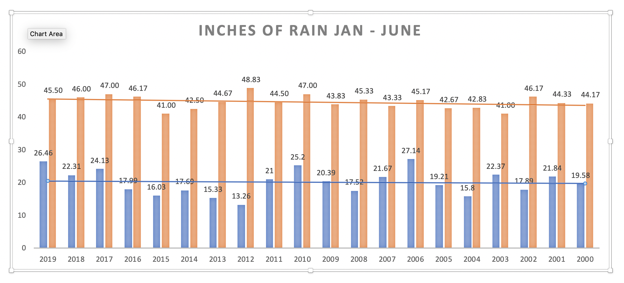 To test this I tabulated historic data going back to 2000: a) total precipitation in inches for 6 months (January to June), b) average temperatures measured daily for the same 6 months (January to June). The linear trendlines computed by Excel over the 20 year period, show a slight increase of about 1 degree in average temperature and an increase of about 1 inch of rain per 6 months. Online source of data.