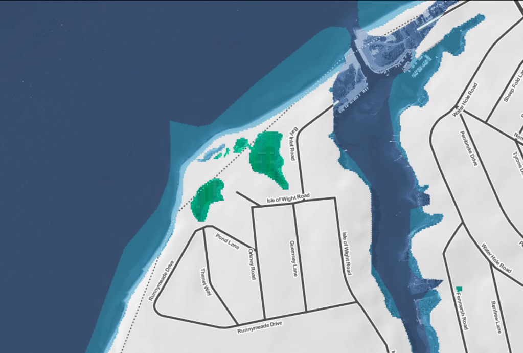 This is a really cool site where you can check the risks of your own home being flooded or under water for the rest of the century. For example I checked my neighborhood (Lionhead and Hog’s creek). By the time there is a 10 foot increase in sea levels my house will be water front property and most likely have a flooded basement. The marina (depicted above) will be under water much sooner. It is located by the inlet to Hog’s creek. There are 2 fresh water ponds (see below in green). They will fuse with the salt water ocean after a 4-5 foot rise in sea levels.