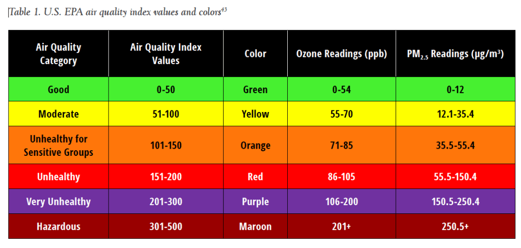 Two pollutants of special concern are particulate matter and ozone. Fine particulate pollution smaller than 2.5 micrometers (PM2.5) poses especially high health risks because it can be deposited deep in the lungs.18 Ozone that forms near the ground is the main ingredient in smog and is associated with adverse health impacts (as opposed to ozone in the high atmosphere, which blocks harmful solar ultraviolet rays from reaching the earth).  These are the main culprits and are most frequently monitored by the numbers of days at a given location where levels are above the EPA’s “safe level”.