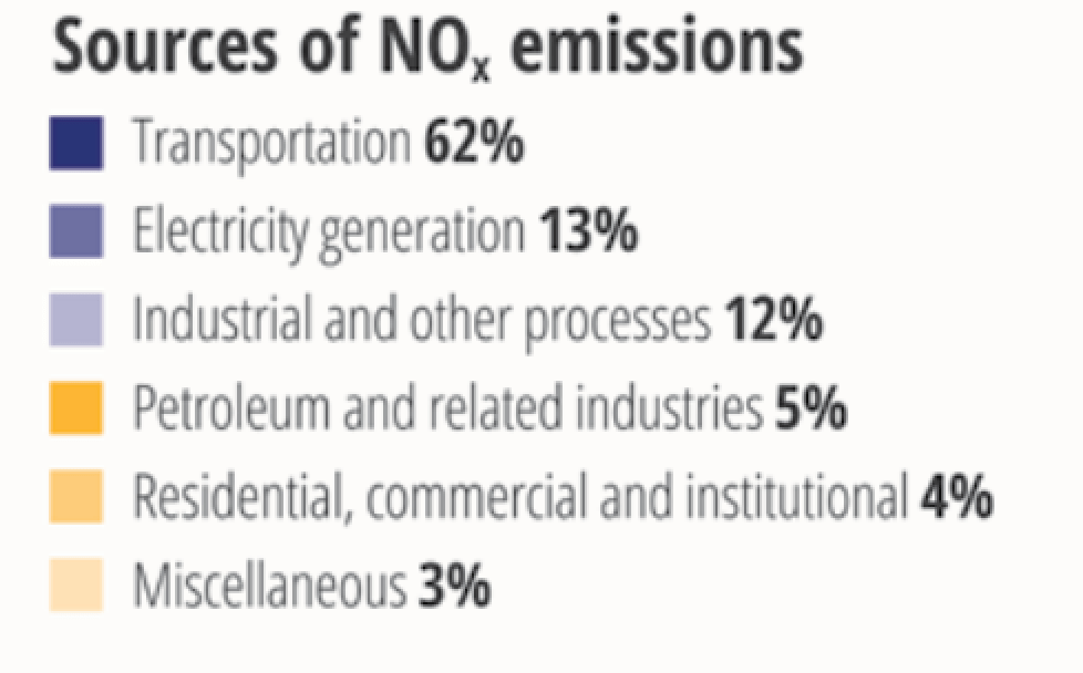 Ozone, the main component of smog, is formed by chemical reactions between nitrogen oxides (NOx) and volatile organic compounds (VOCs) in the presence of sunlight.56 Fossil fuels – both their combustion and production – are major sources of NOx and VOC emissions.